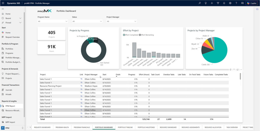 Die Anpassung eines Zeitplans kann sich auf gemeinsame Rollen auswirken, und eine Verschiebung des Budgets kann andere Verpflichtungen beeinflussen. Ohne einen klaren Überblick über diese Zusammenhänge verlangsamen sich Entscheidungen. Durch die Zusammenführung von Portfolio-, Ressourcen-, Finanz- und Risikoinformationen in entscheidungsorientierten Dashboards verwandelt proMX 365 Project Portfolio Management Transparenz in praktische, tägliche Portfoliokontrolle.
